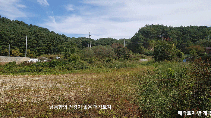 토지의 한쪽 면이 하천부지에 길게 접하여 있어 계곡물이 토지 옆으로 흐르며, 남동향으로 볕도 잘 들고 아늑한 분위기의 활용도가 좋은 토지입니다.
