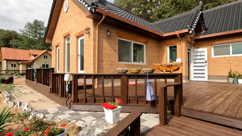 외부에는 현관 앞에 데크를 넓게 시공해서 활용하기 좋고 그 앞에 잔디 정원이 아기자기하게 잘 가꾸어져 있고 주차 공간에는 자갈이 아닌 포장을 깔끔하게 해서 흙먼지 날림 없이 깔끔하게 여러 대 주차할 수 있도록 했습니다.