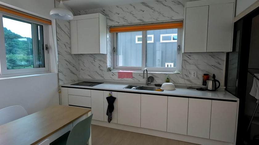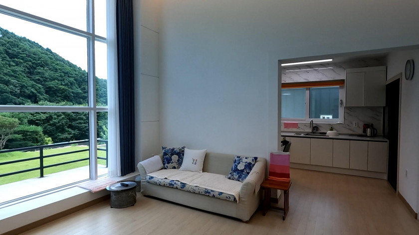 내부는 방 2, 화장실 2, 거실, 주방, 다용도실로 구성되어 있고, 거실의 천장고가 높고 강 조망과 기암괴석의 멋진 절경을 집 내부에서 볼 수 있도록 거실 창을 크게 시공하였습니다.