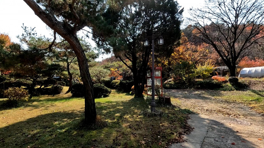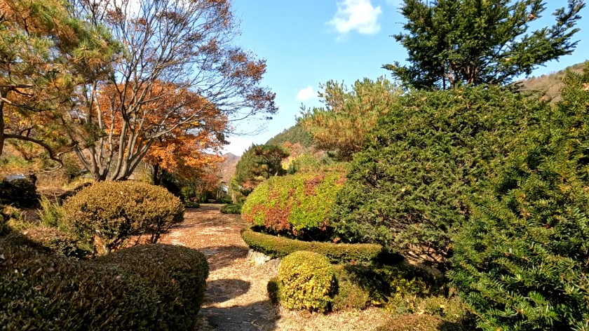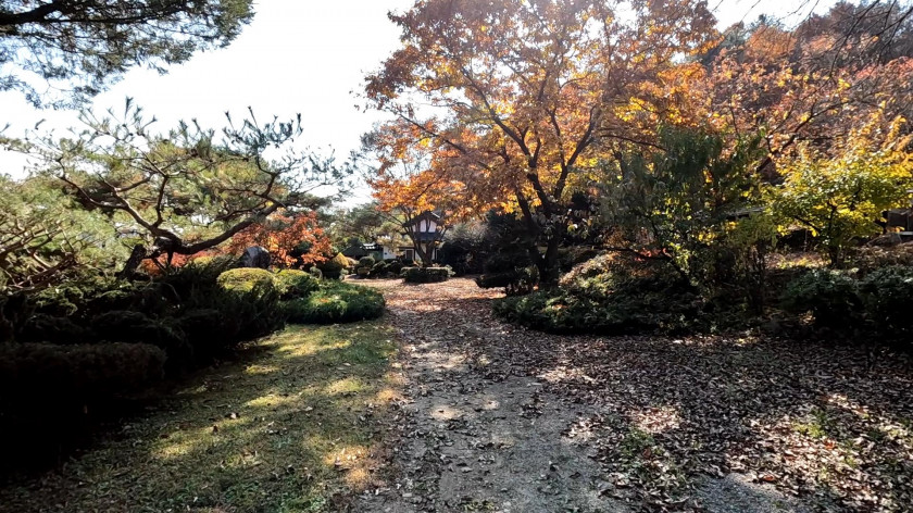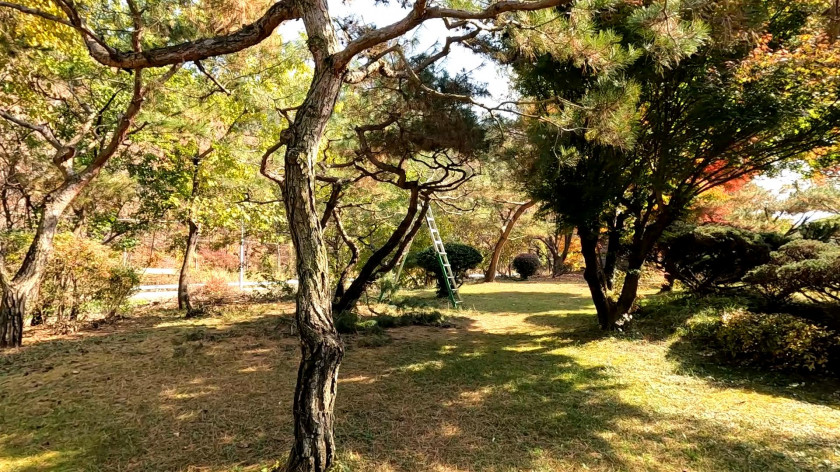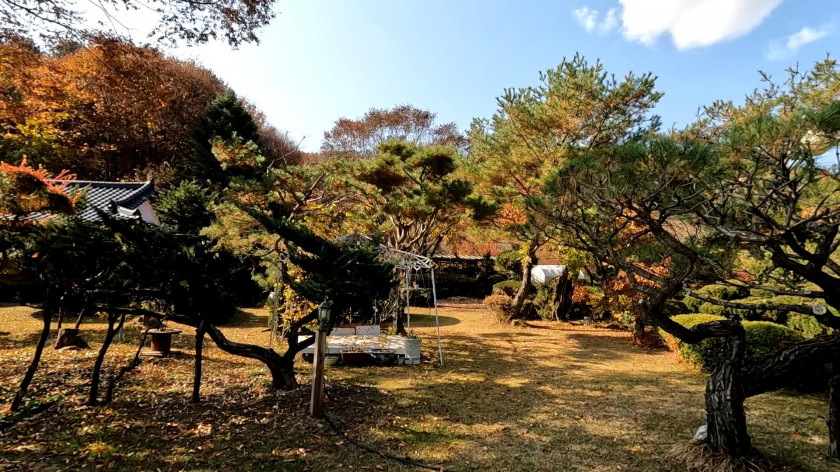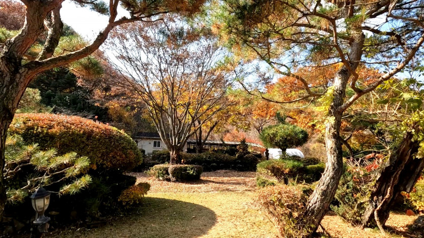 넒은 잔디마당에 주인분 손에 정성스럽게 가꾸어진 수많은 오래된 정원수들.