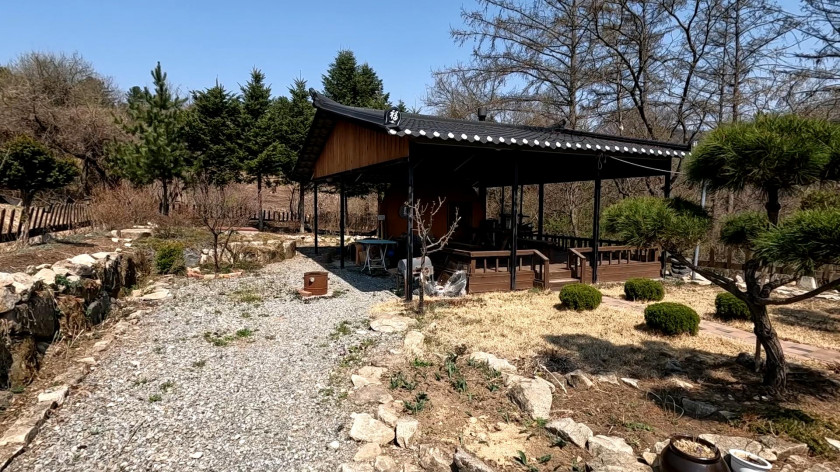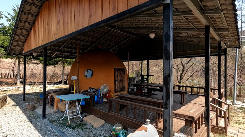 주택 외에 아궁이 찜질을 할 수 있는 돔 형태의 황토방이 별도로 있으며, 넓은 처마 공간을 만들어서 야외 바비큐나 다양한 활동을 할 수 있습니다.