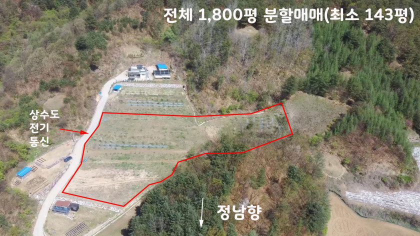 토지는 전체 1,800평으로 평당 35만원으로 최소 면적 143평 이상으로 분할 매각하는 토지입니다.
