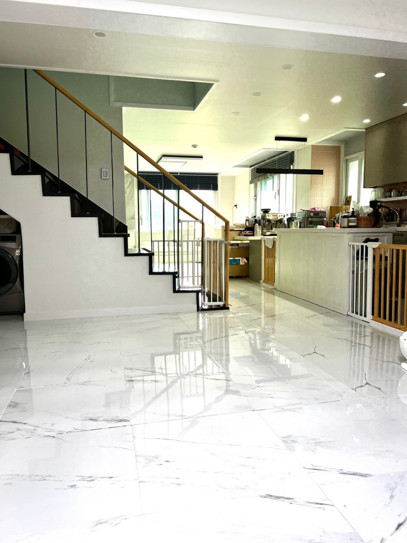 내부 계단을 통해 올라가는 2층은 25평으로 넓은 거실 공간과 방 2, 화장실 1, 다용도실로 되어 있습니다.