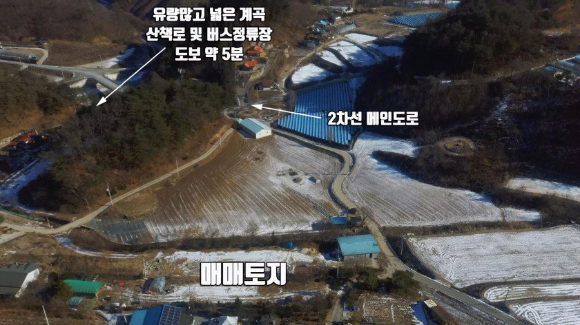 축사나 송전탑이 없고, 메인 도로에서 접근성이 좋으며, 토지가 긴 직사각형에 한쪽 면 전체가 계곡에 길게 접한 대지화된 토지입니다.