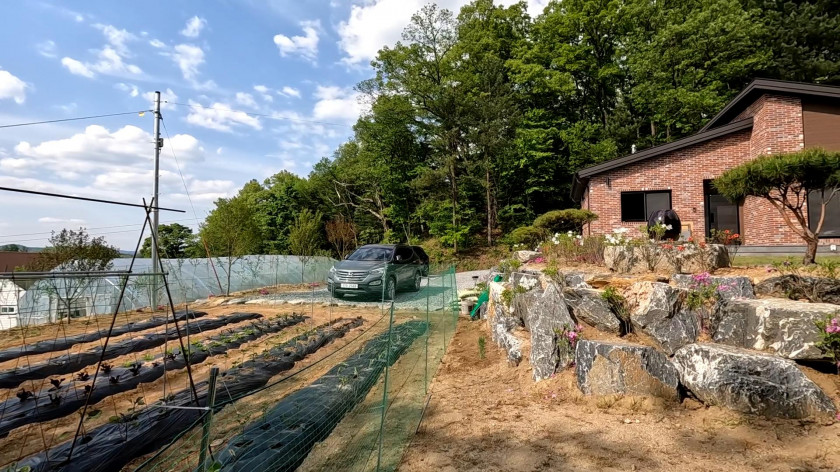 외부에는 나무데크 대신에 석판으로 데크 공간을 만들어서 관리를 편하게 하였고, 적당한 잔디정원과 넓은 텃밭 공간, 그리고 6~8대 주차가 가능한 넓은 주차공간이 있습니다.
