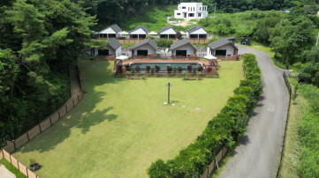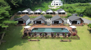 숙박시설은 15평 독채객실 4개와 16.5평의 독채객실 4개로 되어 있고, 그 중 16.5평의 4개 객실은 각각 별도로 사용할 수 있는 수영장과 정원공간 및 바비큐 공간이 있습니다.