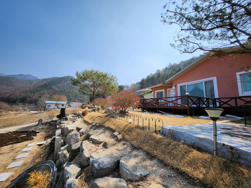 최근에 데크를 넓게 확장하고, 석축공사와 잔디 조성을 다시 하여 주택 앞쪽의 공간이 잘 되어 있습니다.
