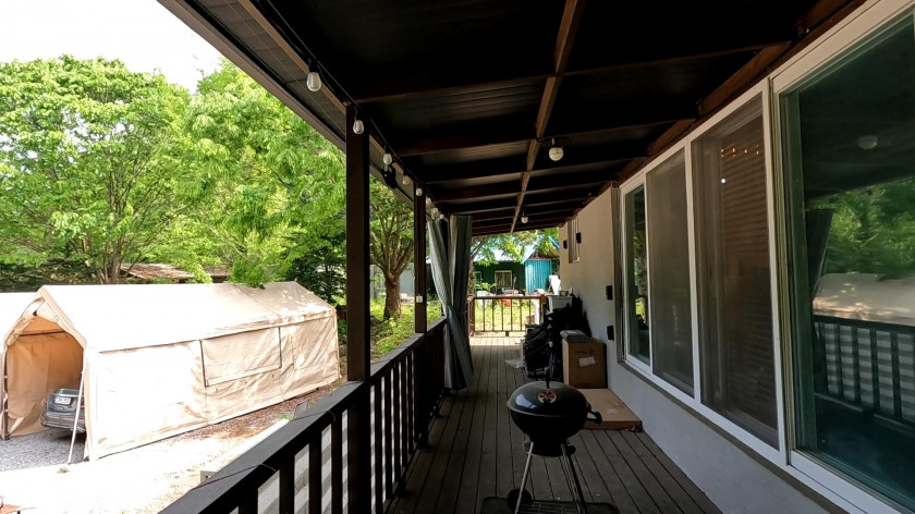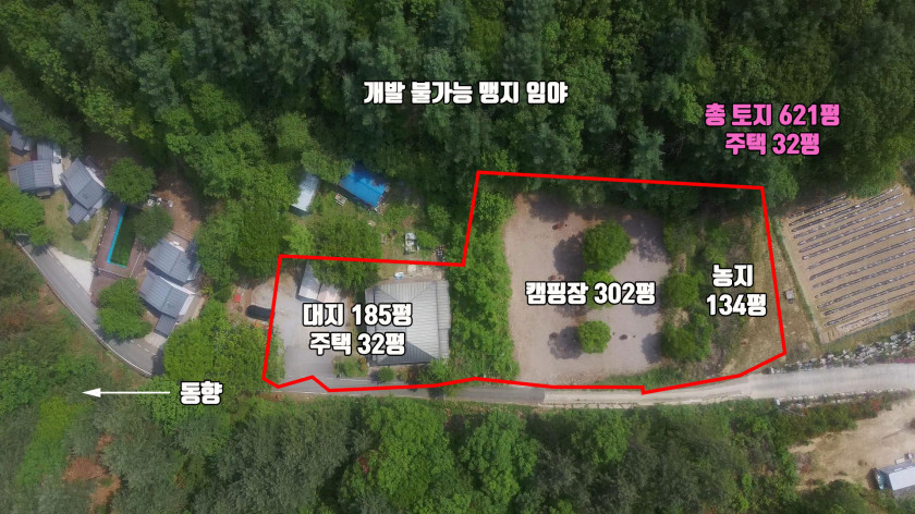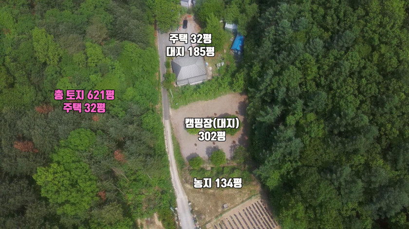 토지는 주택이 있는 대지가 185평이고, 주택 뒤쪽으로 현재 캠핑장으로 활용하고 있는 대지가 302평이 있습니다.