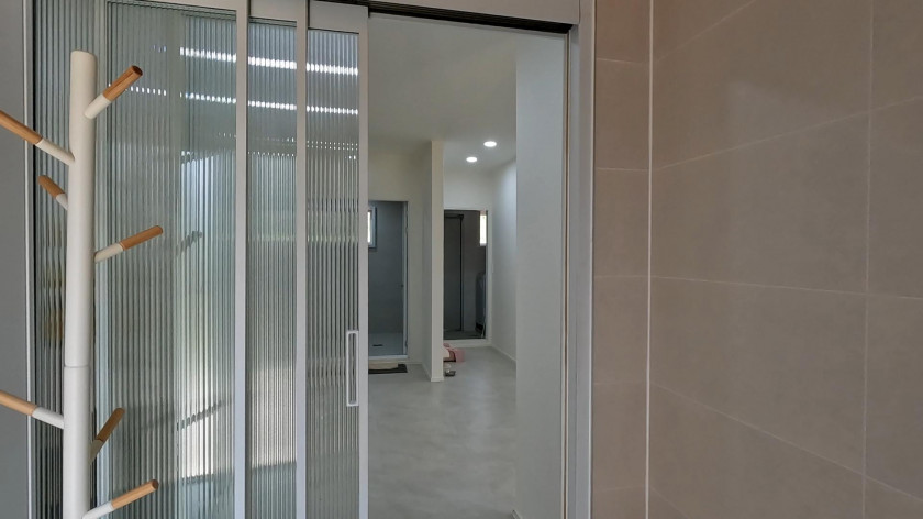 바닥은 대리석 느낌의 타일로 깔끔하게 마무리하였고, 거실과 현관 앞의 외부 바닥은 테크 대신 대리석으로 시공하였습니다.