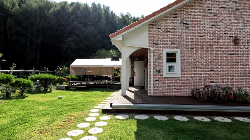 거실 앞쪽은 외부에 넓은 데크가 설치되어 있고, 외벽을 벽돌로 마감하고 지붕은 기와지붕을 사용하여 관리하기 편하고 내구성이 좋습니다.