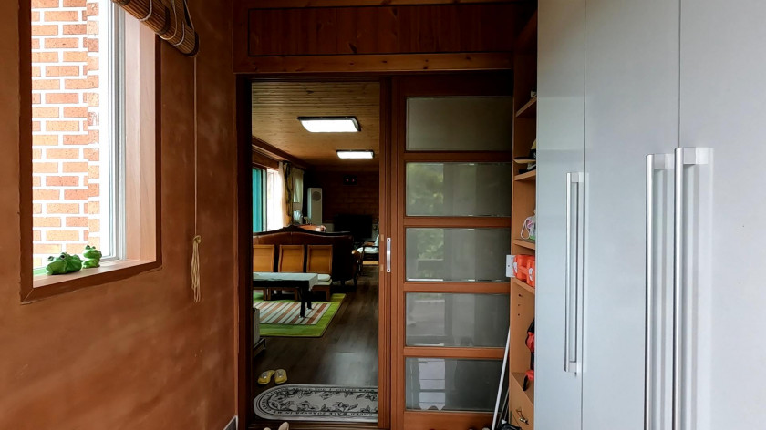 주택은 긴 직사각형 형태로 거실과 주방이 넓게 되어 있고, 내부는 황토 벽돌로 마감하고 외부는 벽돌로 마감하였습니다.