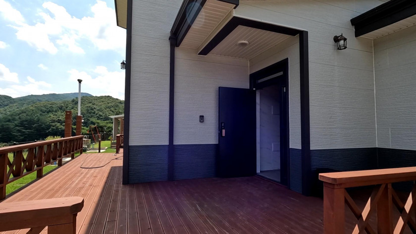 거실 앞쪽은 넓은 데크가 설치되어 있고, 데크에서 보이는 강 조망과 탁 트인 주변 환경이 좋은 경치가 좋은 홍천강 주택입니다.
