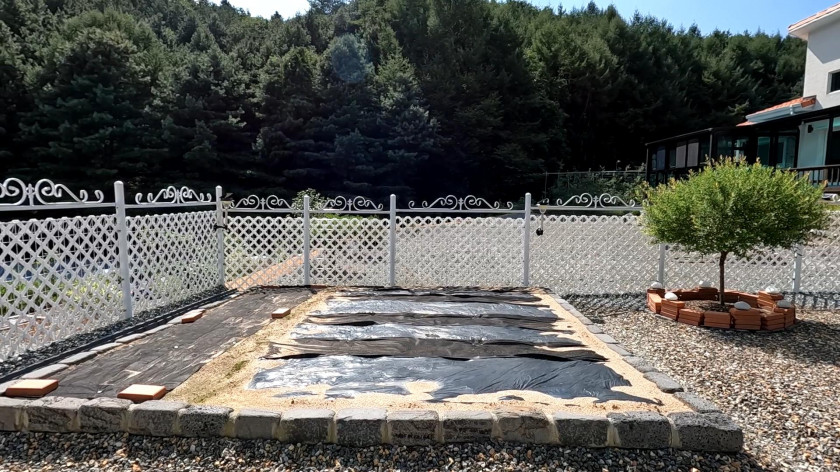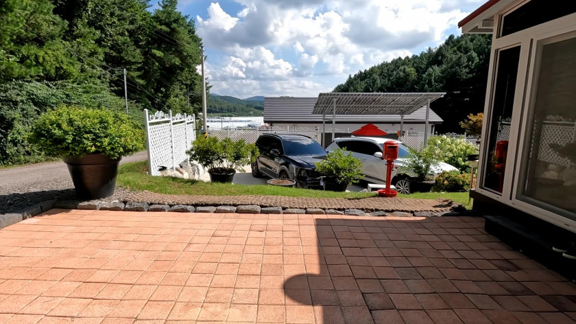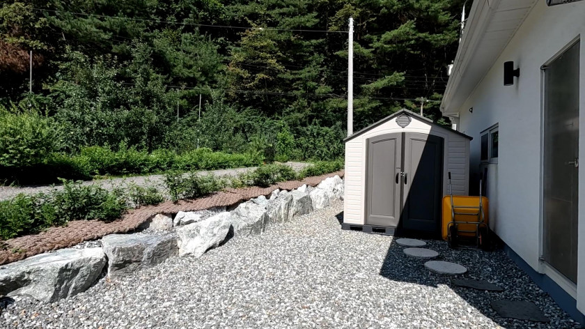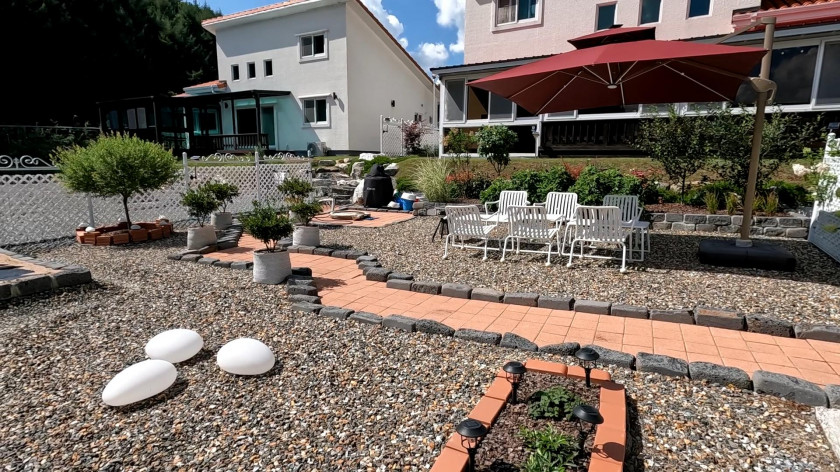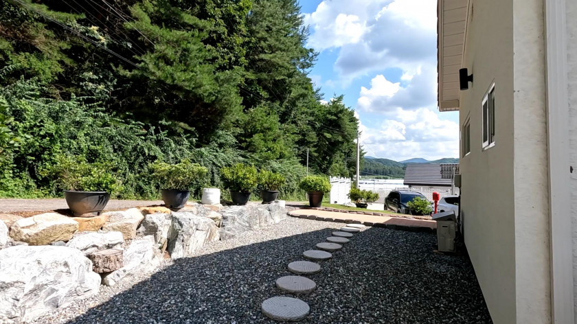 주택 앞의 마당 공간은 절반 정도는 콘크리트로 잘 포장을 하였고 나머지 절반은 자갈과 돌담으로 이쁘게 조경을 하고 텃밭 공간을 조성하였습니다.