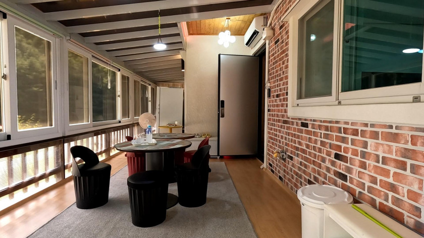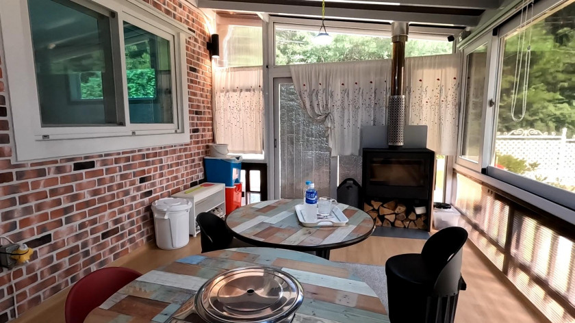 주택 전면부 전체를 12평 정도로 판넬지붕과 샷시로 단열을 신경 쓴 썬룸공간이 추가로 있고, 벽난로 및 에어컨도 설치되어 있어서, 사계절 모두 편하게 바베큐나 파티를 즐길 수 있습니다.