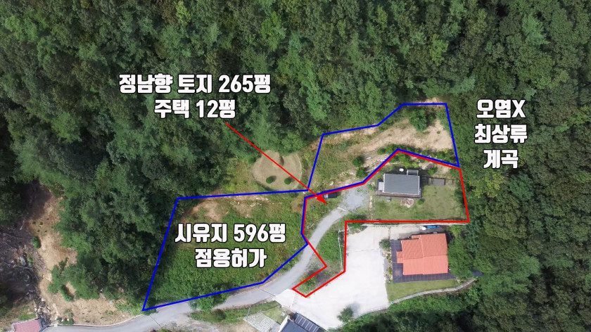 그리고 토지 옆의 아래쪽에는 오염이 전혀 없고 나만 사용할 수 있는 독립적인 맑은 계곡물이 흐르고 있습니다.(높이 차이가 있어서 내려가는 철재 계단과 같은 계단이 필요함)