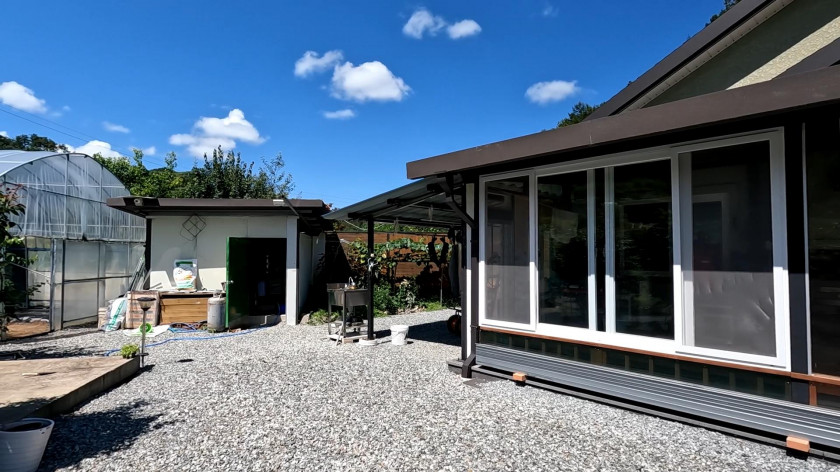 바닥은 데크가 아닌 콘크리트를 타설 한 후 관리할 것이 없는 판석으로 시공하였고, 앞쪽 전체가 샷시로 설치되어 있으며, 지붕은 단열재 판넬로 시공하여 여름철에도 뜨겁지 않고 시원하게 공간을 활용할 수 있습니다.