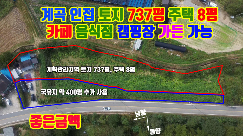 토지 용도 : 계획관리지역(음식점, 상가 건축 가능 - 건폐율 40%, 용적률 100%)
