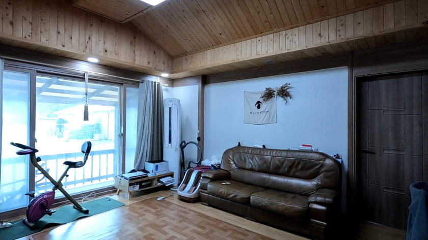 주택은 30평으로 방 3, 화장실 2, 거실, 주방, 다용도실로 되어 있고, 난방은 기름보일러 및 화목보일러 겸용이며, 급수는 지하수를 사용하고 있습니다. 내부는 4인 가족이 거주하기에 문제가 없도록 공간이 구성되어 있습니다.