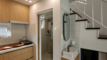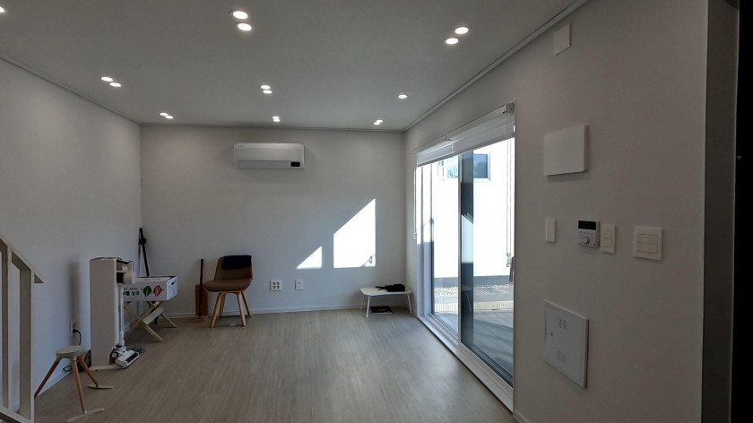 1층은 바닥이 포세린타일로 깔끔하게 시공되고 폴딩도어와 환풍기가 설치된 썬룸공간이 현관 앞에 설치되어 있어서 다양한 공간으로 활용할 수 있고, 현관을 열고 들어가면 원룸 형식으로 주방과 화장실이 있는 구조입니다.