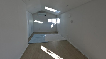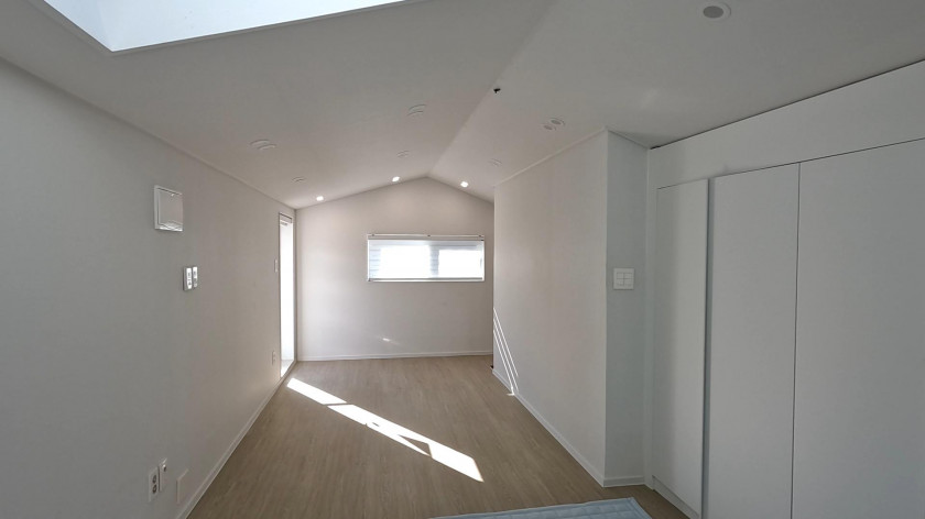 한쪽 벽면에 길게 통풍 기능이 있는 붙박이장이 설치되어 있어서 수납이 용이하며, 천장에 창이 있어서 햇빛이 잘 들고 밤에는 별구경도 할 수 있습니다. 1층의 썬룸공간 위에 2층과 연결되는 외부 테라스 공간이 있어서 작은 나만의 카페 공간을 만들 수도 있습니다.