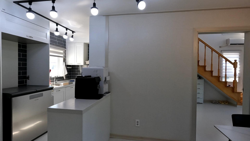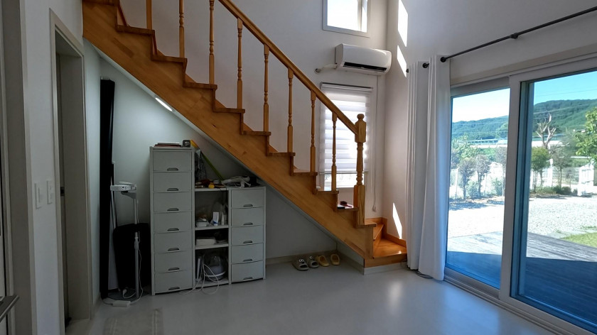 내부는 전체 방 3(방 1개는 옷방으로 사용), 화장실 2, 드레스룸, 거실, 주방, 다용도실, 복층형 다락방으로 구성되어 있고, 이중창과 삼중창을 사용하여 단열에 신경 쓰면서 채광을 매우 좋게 하였습니다.