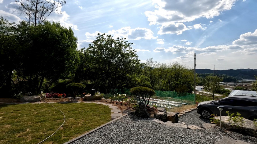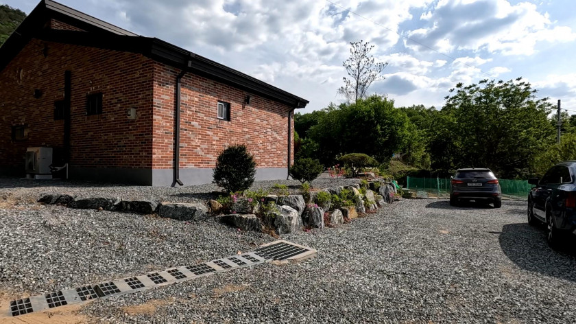 외부에는 나무데크 대신에 석판으로 데크 공간을 만들어서 관리를 편하게 하였고, 적당한 잔디정원과 넓은 텃밭 공간, 그리고 6~8대 주차가 가능한 넓은 주차공간이 있습니다.