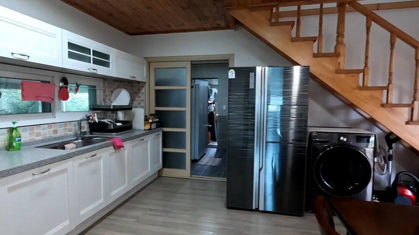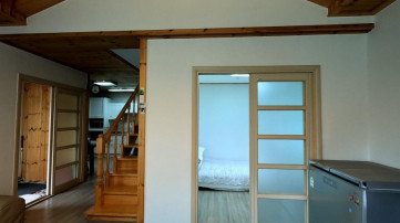 1층은 25평으로 방 2, 화장실 2, 거실과 분리된 주방, 다용도실로 되어 있고, 내부계단을 통해 올라가는