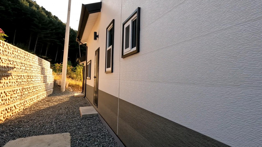 외벽은 메탈서머 사이딩으로 마감되었고 지붕쪽은 아스팔트슁글로 마감되어 전체적으로 깔끔한 외관과 관리가 용이하게 되어 있습니다.