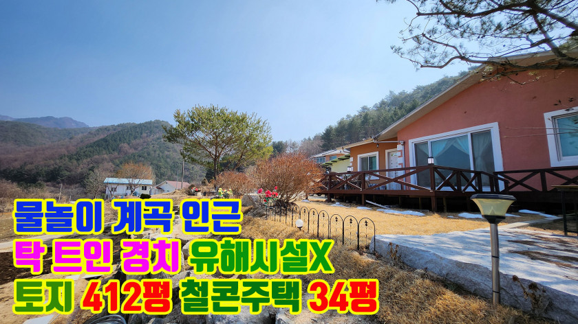 유해시설 없고 경치가 좋으며, 놀 수 있는 계곡이 가까운 30평 이상 철근콘크리트 전원주택과 300평 이상 토지를 2억 초중반대에서 찾으셨다면 적극 추천드립니다.
