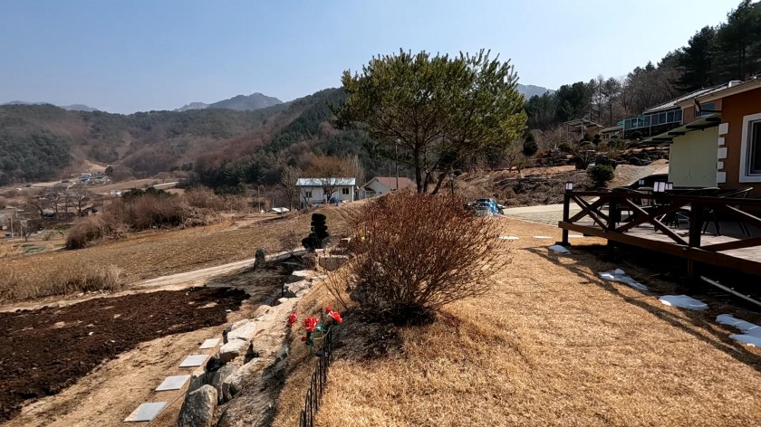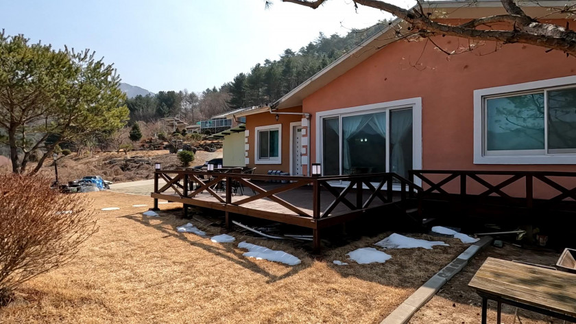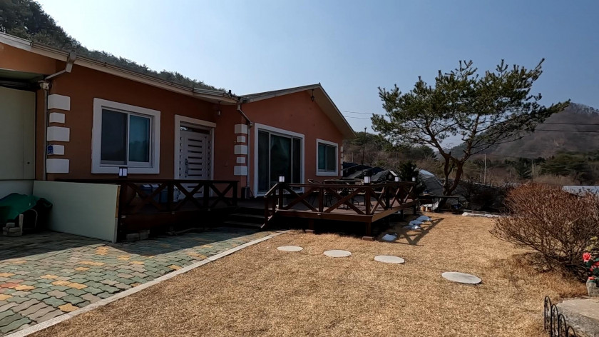 최근에 데크를 넓게 확장하고, 석축공사와 잔디 조성을 다시 하여 주택 앞쪽의 공간이 잘 되어 있습니다.