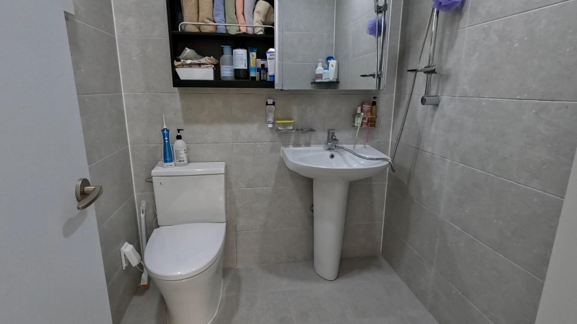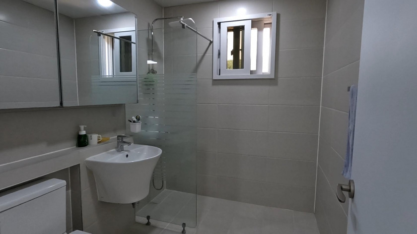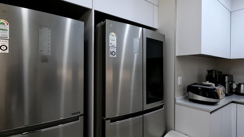 바닥은 대리석 느낌의 타일로 깔끔하게 마무리하였고, 거실과 현관 앞의 외부 바닥은 테크 대신 대리석으로 시공하였습니다.