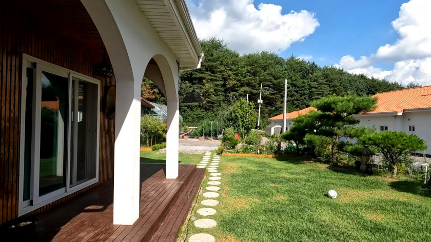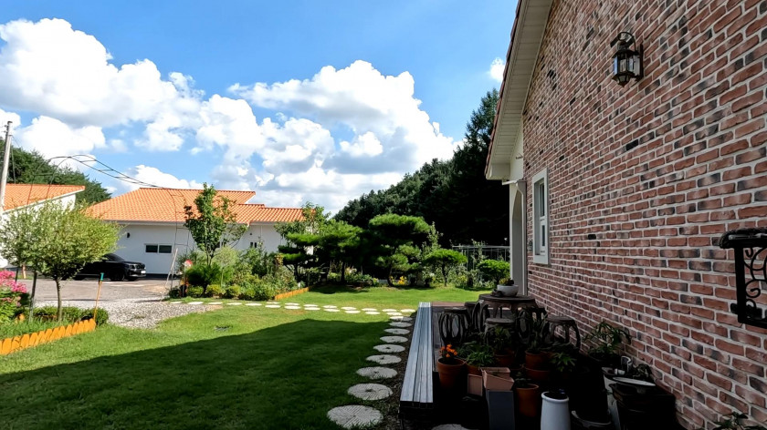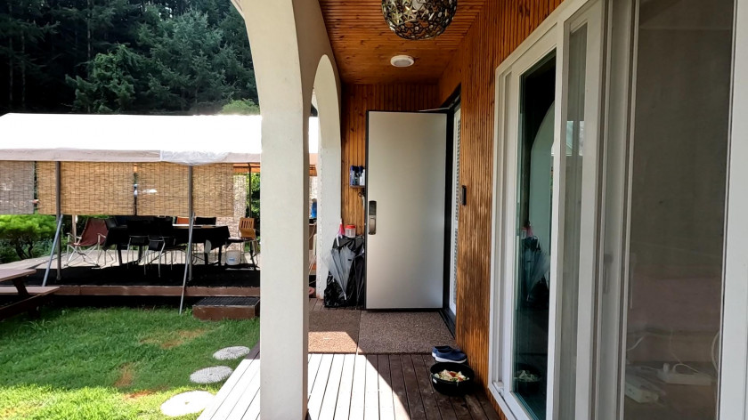거실 앞쪽은 외부에 넓은 데크가 설치되어 있고, 외벽을 벽돌로 마감하고 지붕은 기와지붕을 사용하여 관리하기 편하고 내구성이 좋습니다.