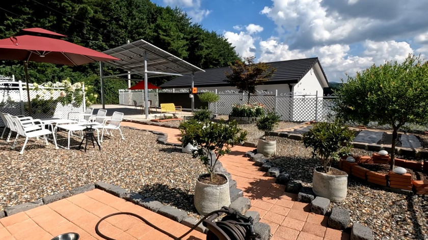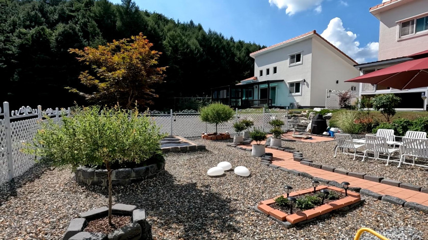 주택 앞의 마당 공간은 절반 정도는 콘크리트로 잘 포장을 하였고 나머지 절반은 자갈과 돌담으로 이쁘게 조경을 하고 텃밭 공간을 조성하였습니다.