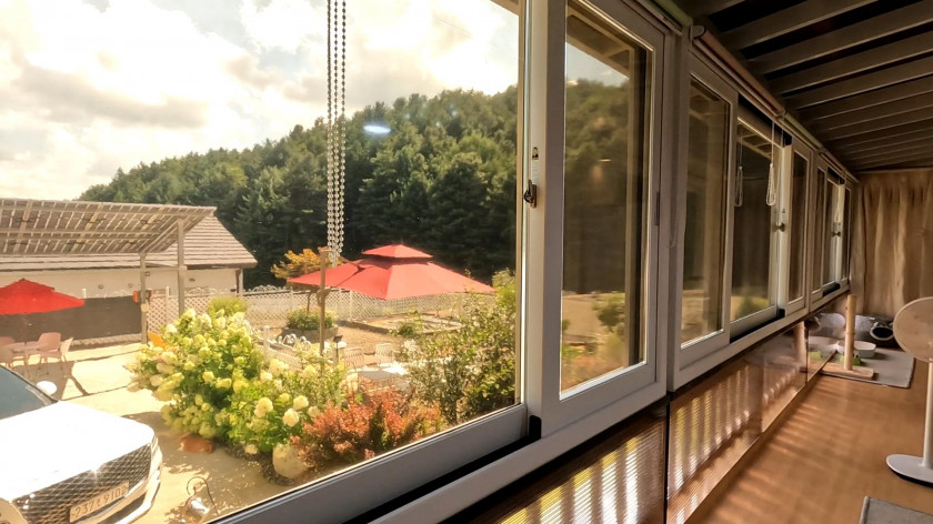 주택 전면부 전체를 12평 정도로 판넬지붕과 샷시로 단열을 신경 쓴 썬룸공간이 추가로 있고, 벽난로 및 에어컨도 설치되어 있어서, 사계절 모두 편하게 바베큐나 파티를 즐길 수 있습니다.