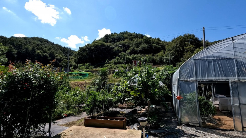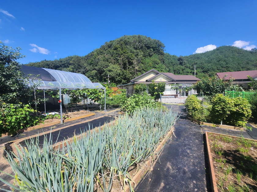 농지에는 작물 종류별로 텃밭으로 사용하는 공간을 구분하고 나머지 공간은 잡초 매트를 시공해서 깔끔하게 농사짓고 이동할 수 있도록 하였으며, 비닐하우스가 설치되어 있습니다.