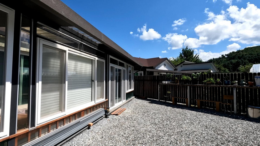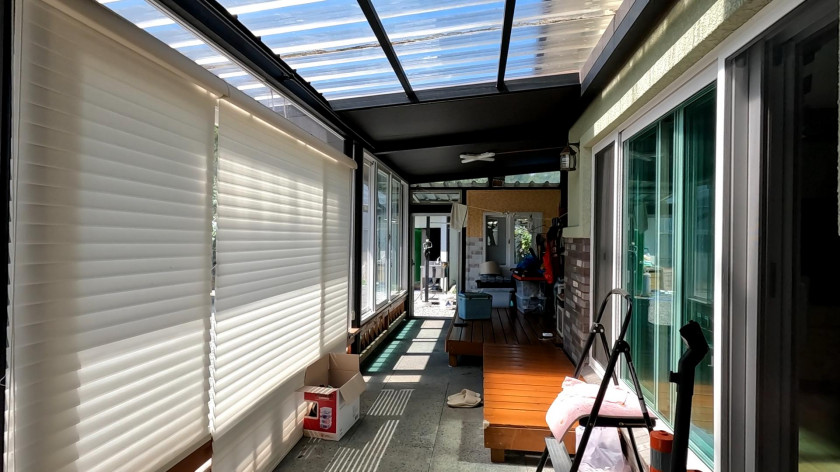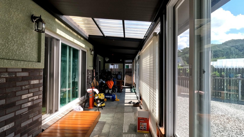바닥은 데크가 아닌 콘크리트를 타설 한 후 관리할 것이 없는 판석으로 시공하였고, 앞쪽 전체가 샷시로 설치되어 있으며, 지붕은 단열재 판넬로 시공하여 여름철에도 뜨겁지 않고 시원하게 공간을 활용할 수 있습니다.