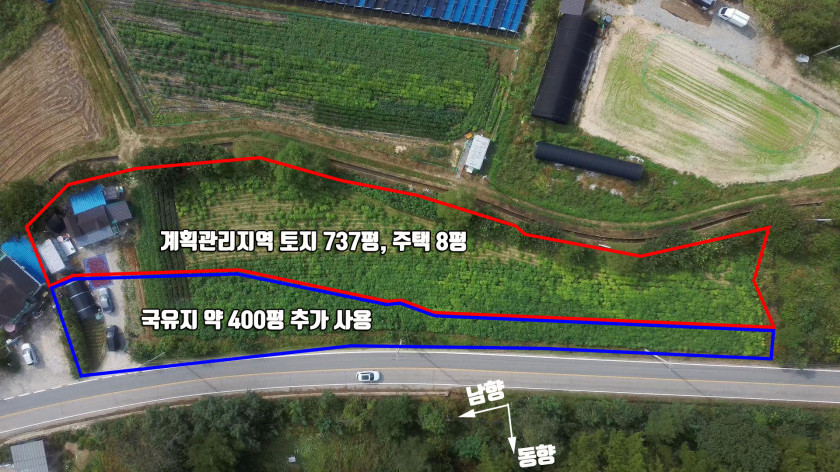 특히 도로와 토지 사이의 국유지 약 400평을 농지로 추가 사용하고 있어서, 향후 국유지를 활용할 수 있는 조건(식당을 운영할 경우 주차공간 등)도 매우 좋습니다.