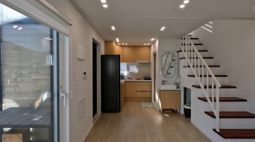 1층은 바닥이 포세린타일로 깔끔하게 시공되고 폴딩도어와 환풍기가 설치된 썬룸공간이 현관 앞에 설치되어 있어서 다양한 공간으로 활용할 수 있고, 현관을 열고 들어가면 원룸 형식으로 주방과 화장실이 있는 구조입니다.